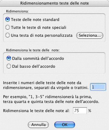 · Annulla. Cliccate su OK per procedere con il ridimensionamento. Cliccate su Annulla per tornare alla partitura senza effettuare il ridimensionamento delle teste delel note.