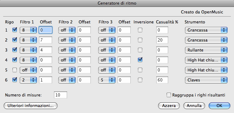 Il plug-in crea sino a 6 righi singoli contenenti ciascuno un pattern ritmico. Questi righi vengono aggiunti al file esistente iniziando dalla misura 1.