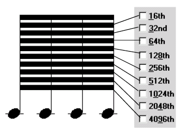 Nota: alcuni dei valori di durata sono inferiori a quelli che potete inserire con lo strumento Inserimento rapido (ad esempio la nota da 4096esimi). L’unica maniera per creare una nota simile è creandola nella finestra Modifica la cornice di battuta e selezionando la sua durata manualmente oppure utilizzando la funzione Durata delle note del sottomenu Cambia del menu Utilità Si veda la finestra di dialogo Modifica la cornice di battuta o la finestra di dialogo Cambia la durata delle note..
