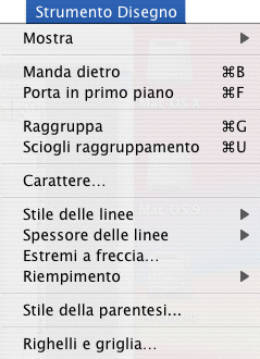 Il menu Strumento Disegno, contiene un numero di comandi che vi permettono di creare il vostro personale simbolo musicale. Per esempio, è possibile specificare lo spessore di una linea, la percentule di riempimento di un rettangolo, se una linea sarà tratteggiata o continua, e così via. Esso contiene anche dei comandi per la manipolazione degli oggetti al momento della creazione—raggruppamento, manda avanti, manda indietro e così via, tipici dei programmi di grafica.