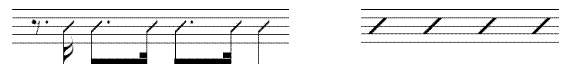 Esistono due tipi di notazione ritmica per chitarra (slash), usate per indicare un accompagnamento ritmico-accordale spesso di tipo improvvisativo. Se volete indicare un accompagnamento libero, per il quale non è richiesto un ritmo specifico, potete lasciare che Finale riempia le battute con delle barre diagonali (slash), distribuite in base all’indicazione di tempo (ad esempio quattro slash in una misura di 4/4, come si vede nella figura sottostante a destra). Se volete invece indicare uno specifico ritmo di accompagnamento, Finale può convertire le teste delle note di un qualsiasi passaggio in slash, mantenendo i raggruppamenti e i gambi delle note (come si vede nella figura di sinistra).