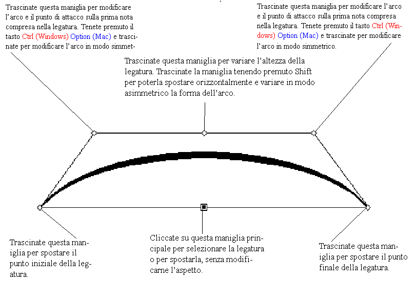 Nota: il trascinamento “forzato” è temporaneamente disabilitato, mentre si edita una legatura. Se volete utilizzarlo premete shift mentre muovete la legatura. Si veda la finestra di dialogo Opzioni del programma - Modifica per avere maggiori informazioni su questo tipo di spostamento.