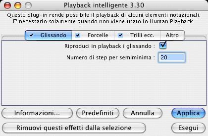 Il plug-in Playback intelligente aggiunge la possibilità di un effetto reale in riproduzione a elementi musicali selezionati quali glissando, forcelle di dinamica e trilli. Il plug-in deve essere avviato dopo che i suddetti elementi sono stati inseriti in partitura. Quando modificate uno di questi elementi dovete eseguire nuovamente il plug-in. Inoltre, nel caso in cui vengano modificate delle note, tutti gli effetti in riproduzione, tranne le forcelle di dinamica, debbono essere rinnovati con una nuova esecuzione del plug-in.