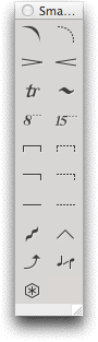 Questa tavolozza spostabile, ridimensionabile, deformabile, contiene icone che rappresentano legature, forcelle di crescendo, quadre orizzontali, linee tratteggiate e continue, e altre Forme ‘Intelligenti’ auto-dimensionanti.