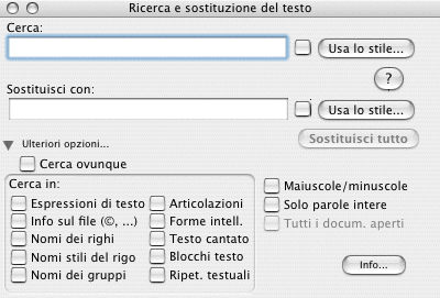 Utilizzando questa finestra di dialogo potrete procedere ad una ricerca rapida di determinate stringhe di testo, per controllarle ed eventualmente sostituirle, all’interno dei blocchi di testo, dei nomi dei righi e dei gruppi, delle forme intelligenti, delle informazioni sul file e del testo cantato.