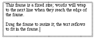 - Fate doppio-click all’interno del documento nel punto in cui volete far apparire il testo e trascinate, tenendo premuto il pulsante del mouse dopo il secondo click, per creare un rettangolo all’interno del quale inserire il testo. Apparirà una cornice di editing delle dimensioni da voi delimitate con il trascinamento con al suo interno un cursore lampeggiante indicante il punto di inserzione del testo. Il posizionamento del punto di inserzione—sinistra, centro, o destra—dipende dalle opzioni di giustificazione selezionate nel menu Testo.