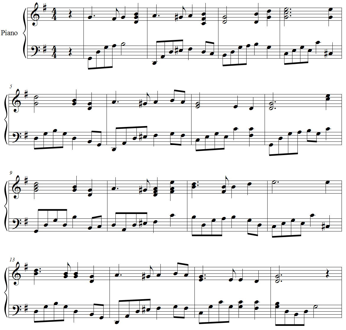 Per fare ancora un po' di pratica con lo Strumento Inserimento semplice, completate la parte per pianoforte del brano. In ogni caso, per esercitarci con il prossimo Tutorial, Modificare la musica inserita in partitura con lo Strumento Inserimento semplice, dovrete aprire il file "Tutorial 2b.MUSX," nel quale la musica è già stata scritta per voi.