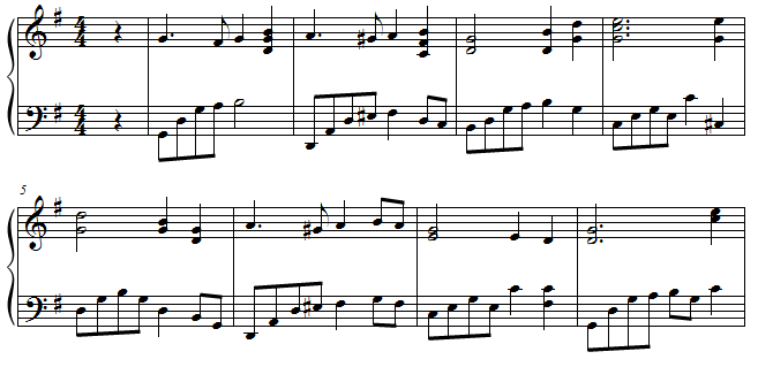 Note. In questo esempio registriamo soltanto le note di ciascun rigo che riguardano una singola voce (quelli che in Finale si chiamano Livelli di scrittura o, più semplicemente, Livelli). Vedremo come inserire le note mancanti nella sezione "Livelli - Polifonia".