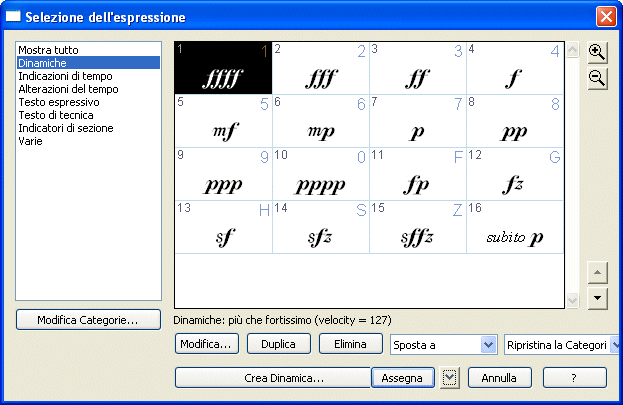 Le indicazioni e simboli per la dinamica, essendo specifiche per ogni strumento, vengono assegnate ai singoli righi (anche se la stessa indicazione può essere assegnata a più righi). Proviamo ad inseire le indicazioni per la dinamica a tre dei nostri righi.