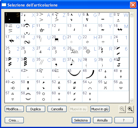 Nell'angolo in alto a destra di ciascun riquadro delle articolazioni c'è un numero. Questo numero è il Metatool assegnato a quella specifica articolazione. Una volta selezionato lo Strumento Articolazioni, potete utilizzare questo metatool per inserire il simbolo che desiderate direttamente in partitura, senza dover aprire la finestra di dialogo.
