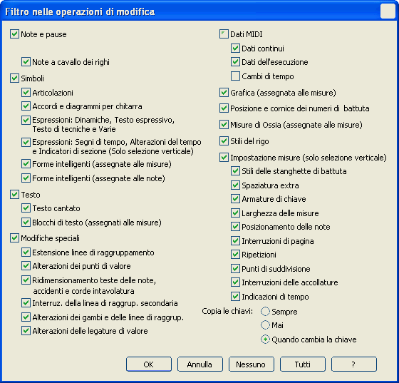Per copiare specifici elementi della partitura, usando il Filtro nelle operazioni di modifica: