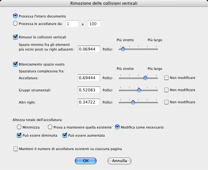 - Bilanciamento spazio vuoto; Spaziatura complessiva fra__ • Accollature__ • Gruppi strumentali__ • Altri righi • [cursori Più stretto/Più largo] • Non modificare. Selezionate questa casella di scelta per poter stabilire l’ammontare minimo di spazio da interporre tra accollature, gruppi strumentali o altri righi. Righi, accollature e gruppi strumentali verranno distanziati in base all’ammontare specificato, indipendentemente dal fatto che sia richiesto ulteriore spazio per il valore minimo fra gli elementi più vicini posti su righi adiacenti, nella sezione Rimuovi le collisioni verticali. Il Bilanciamento si riferisce all’utilizzo di questi comandi in concomitanza con la funzione Rimuovi le collisioni verticali, che può produrre uno spazio inconsistente, ad esempio, se ci sono collisioni tra le accollature in una pagina e non in un’altra. Utilizzate questi controlli impostando uno spazio più piccolo dell’ammontare di spazio minimo specificato nel campo di testo Spazio minimo fra gli elementi più vicini su righi adiacenti.